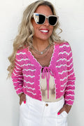 Sale Pink Stripe Crochet Scalloped Trim Lace-up Front Cropped Cardigan