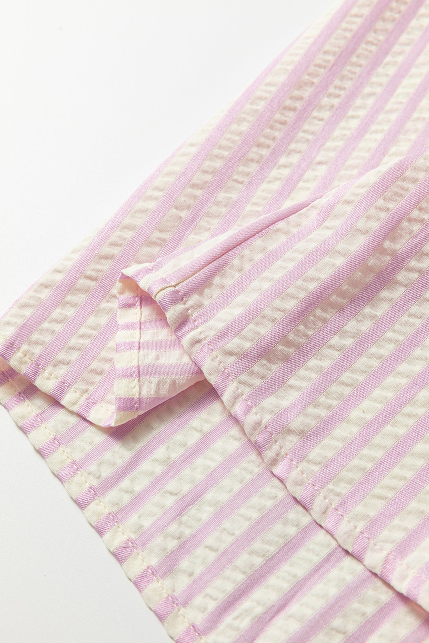 Sky Blue Stripe Bow Knot Textured Short Puff Sleeve Babydoll Blouse