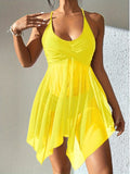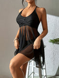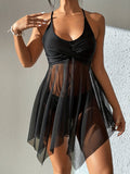 Sale 3-Piece Leaf Plant Print Bikini Sets, Triangle Halter Neck High Cut With Sheer Cover Up Drawstring Overall Swimsuit