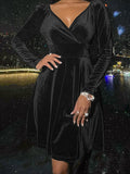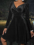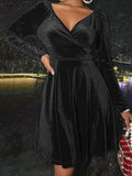 Plain Spring/Fall V Neck Long Sleeve A-Line Midi Dress