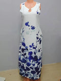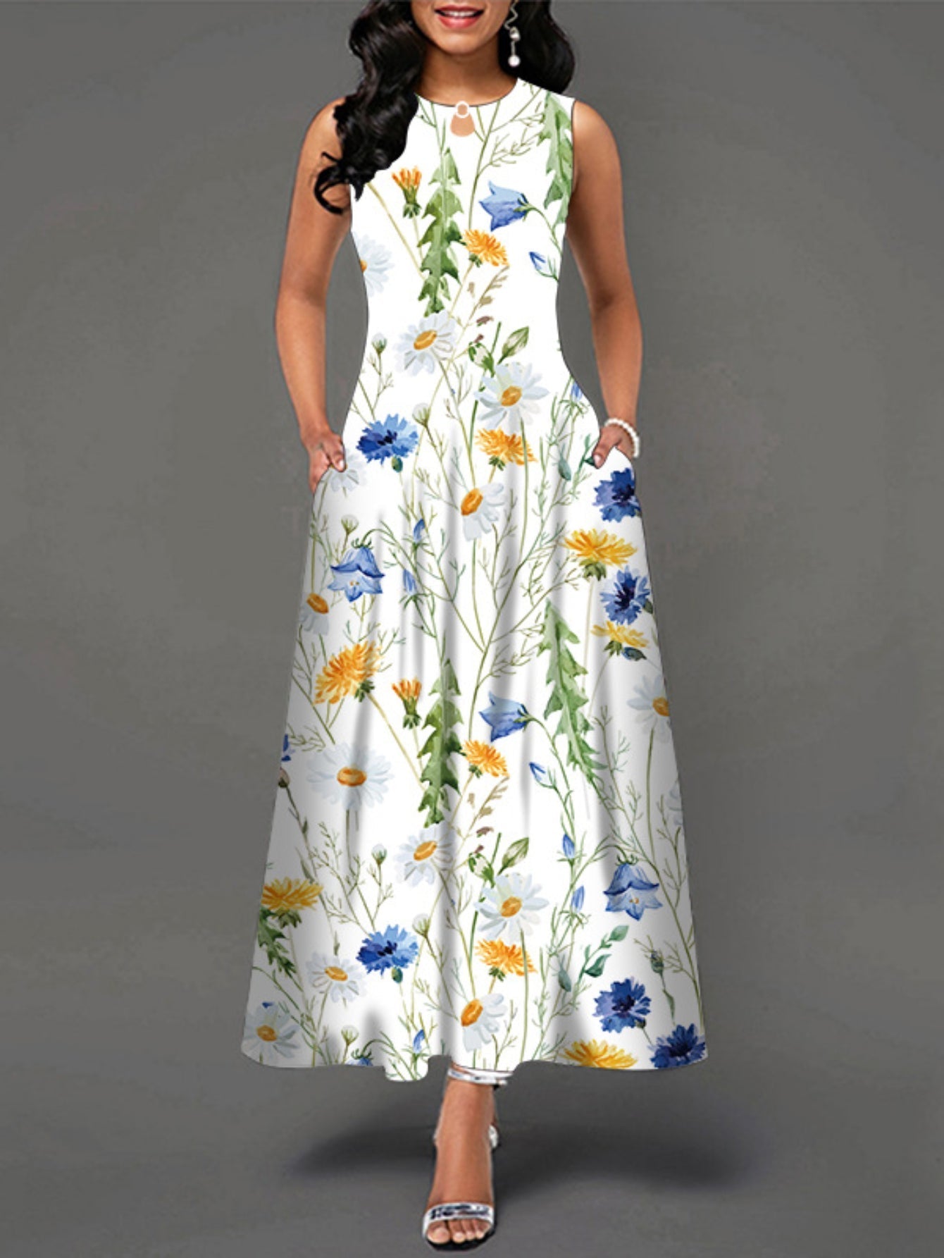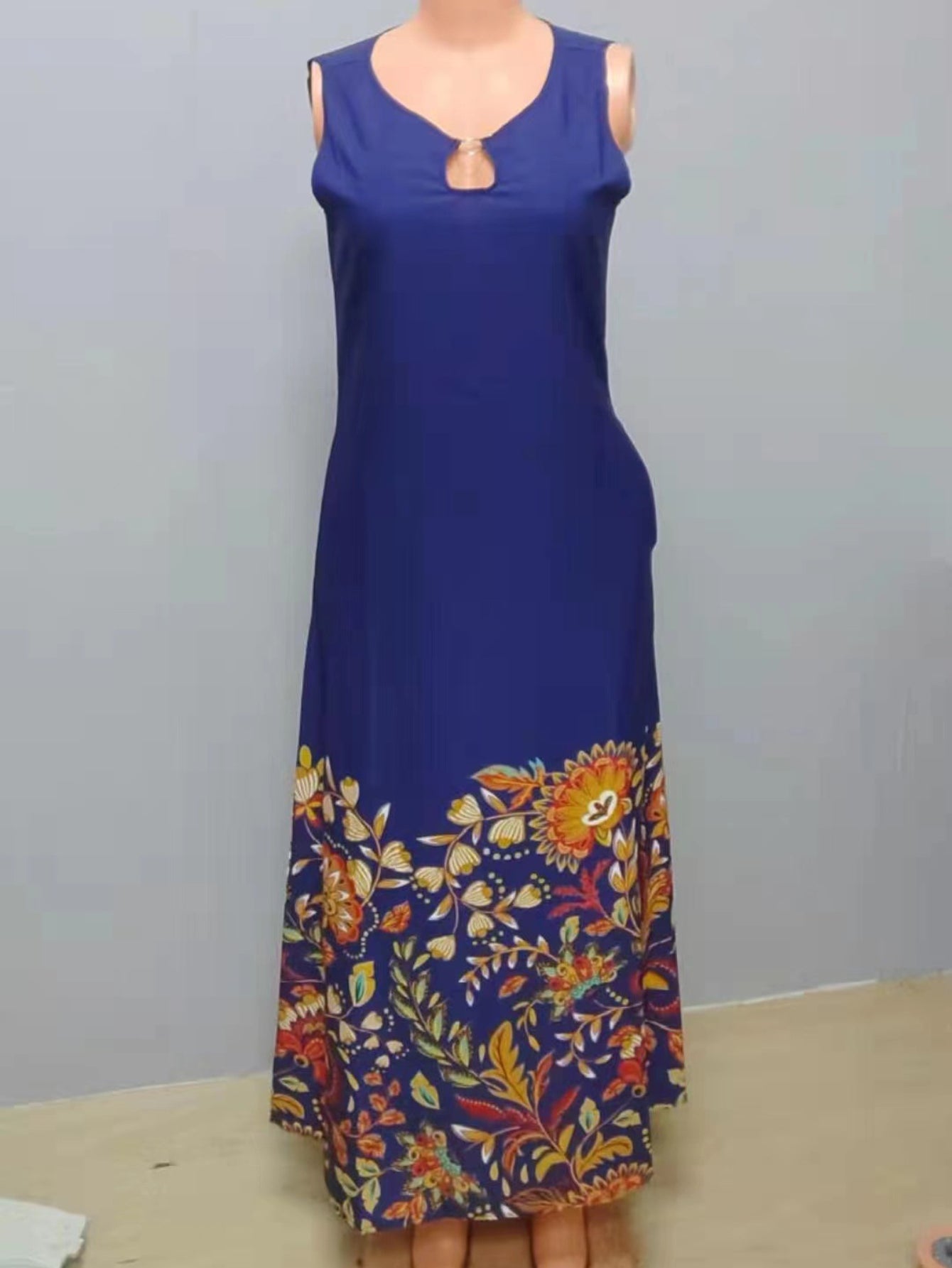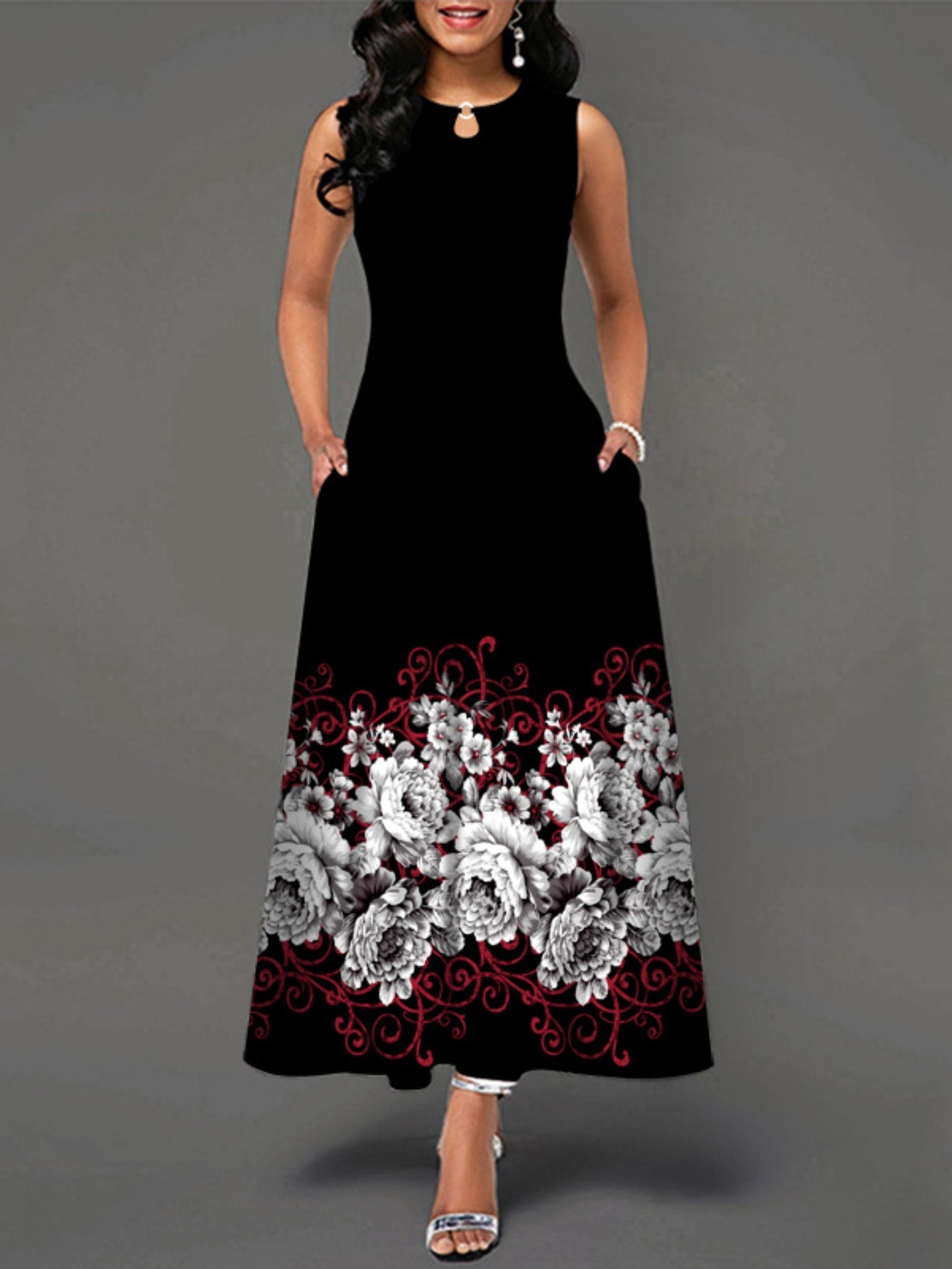 Sale Casual Tank Dress, Colorblock Floral Print Cut Out Round Neck Medium Stretch Maxi Tank Dress