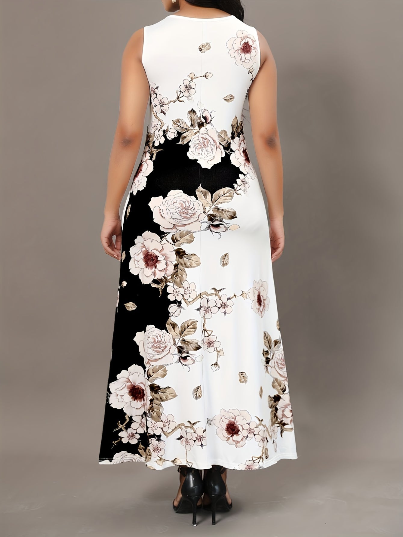 Casual Tank Dress, Colorblock Floral Print Cut Out Round Neck Medium Stretch Maxi Tank Dress