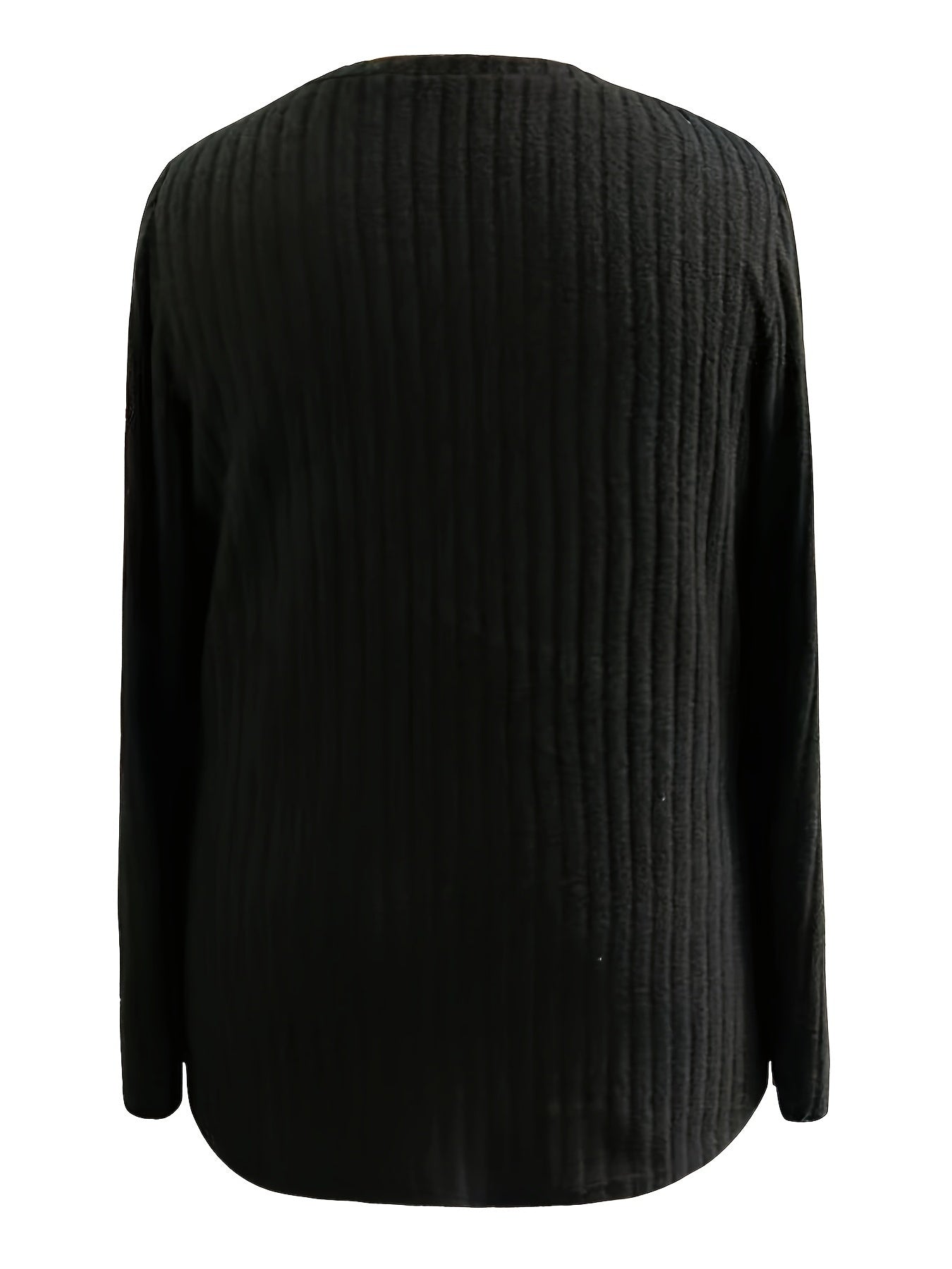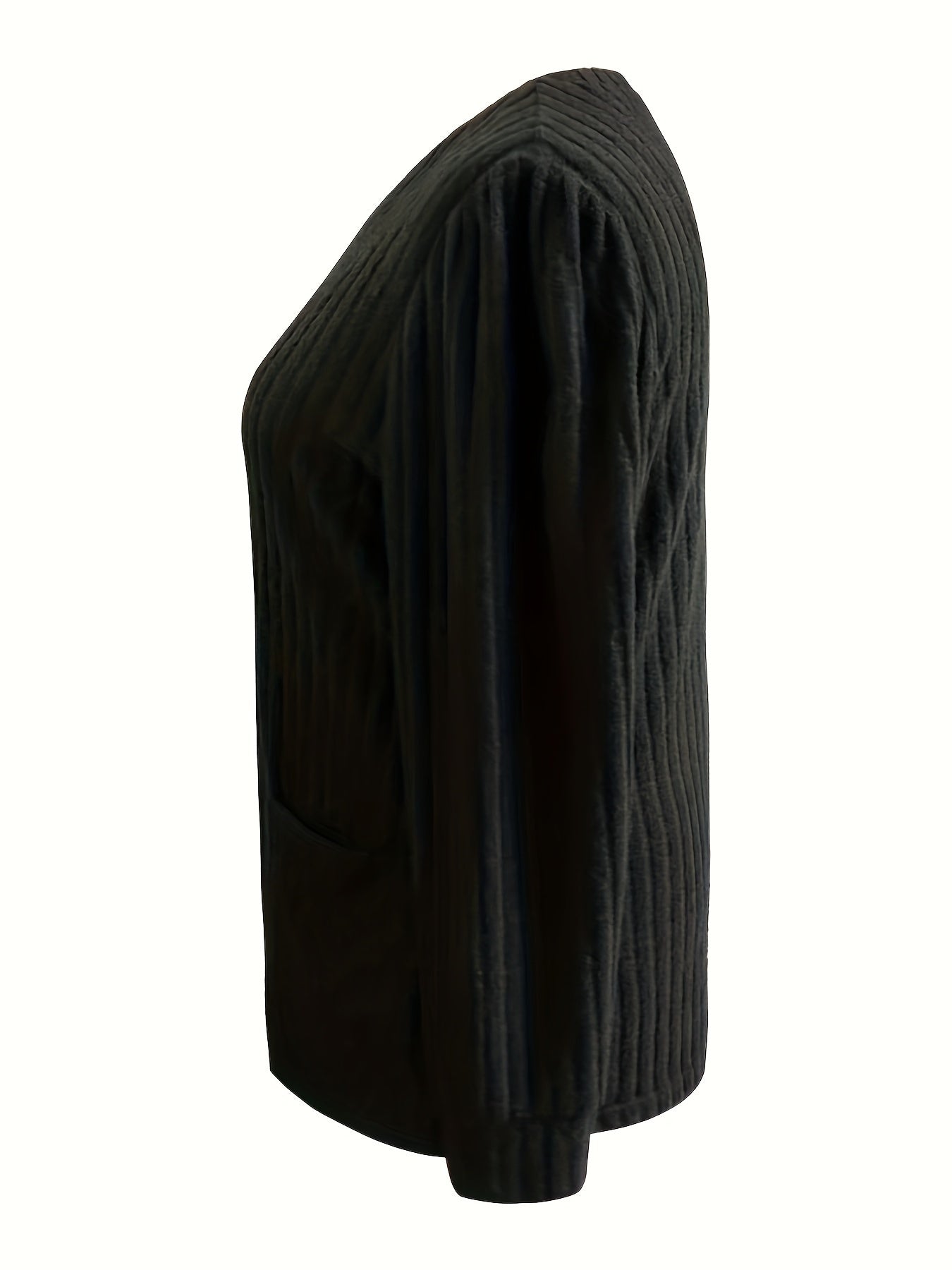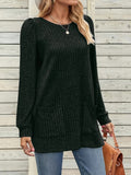Casual Top, Women's Solid Ribbed Long Sleeve Round Neck Medium Stretch Top With Pockets