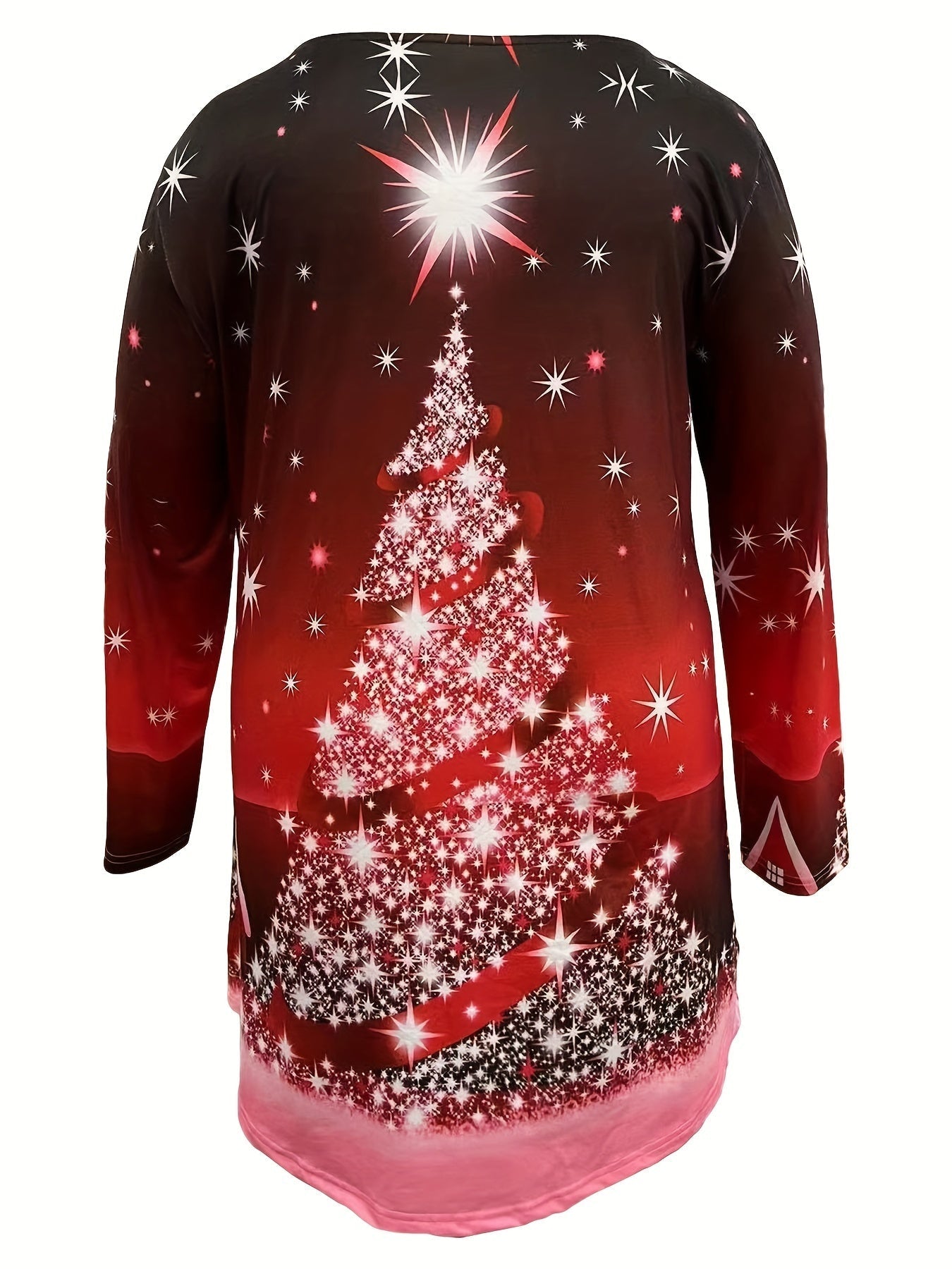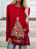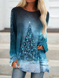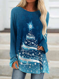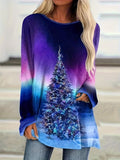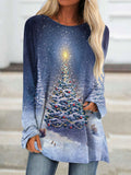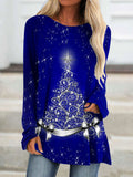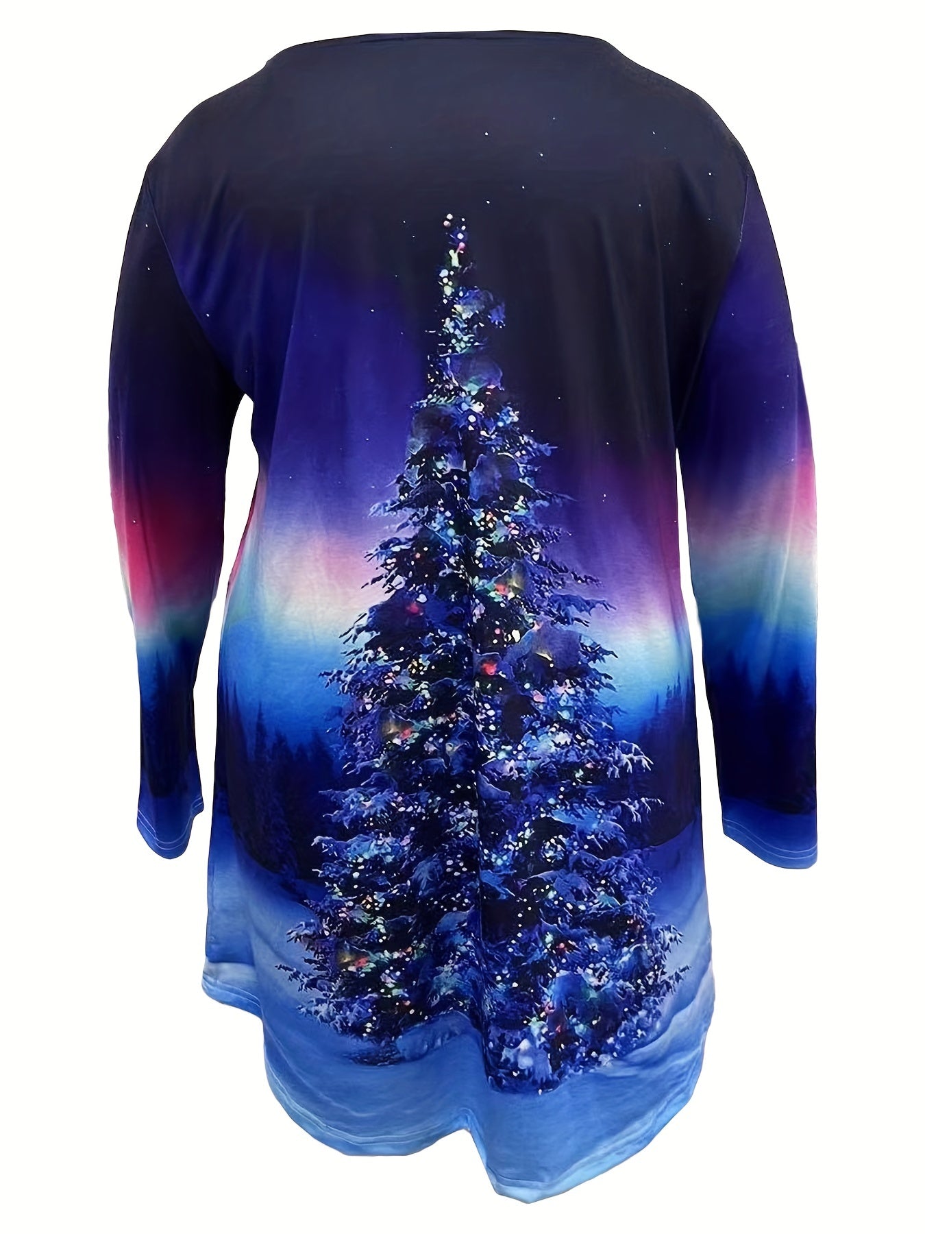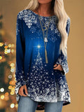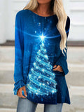Christmas Casual Top, Women's Tree Print Long Sleeve Round Neck Medium Stretch Tunic Top
