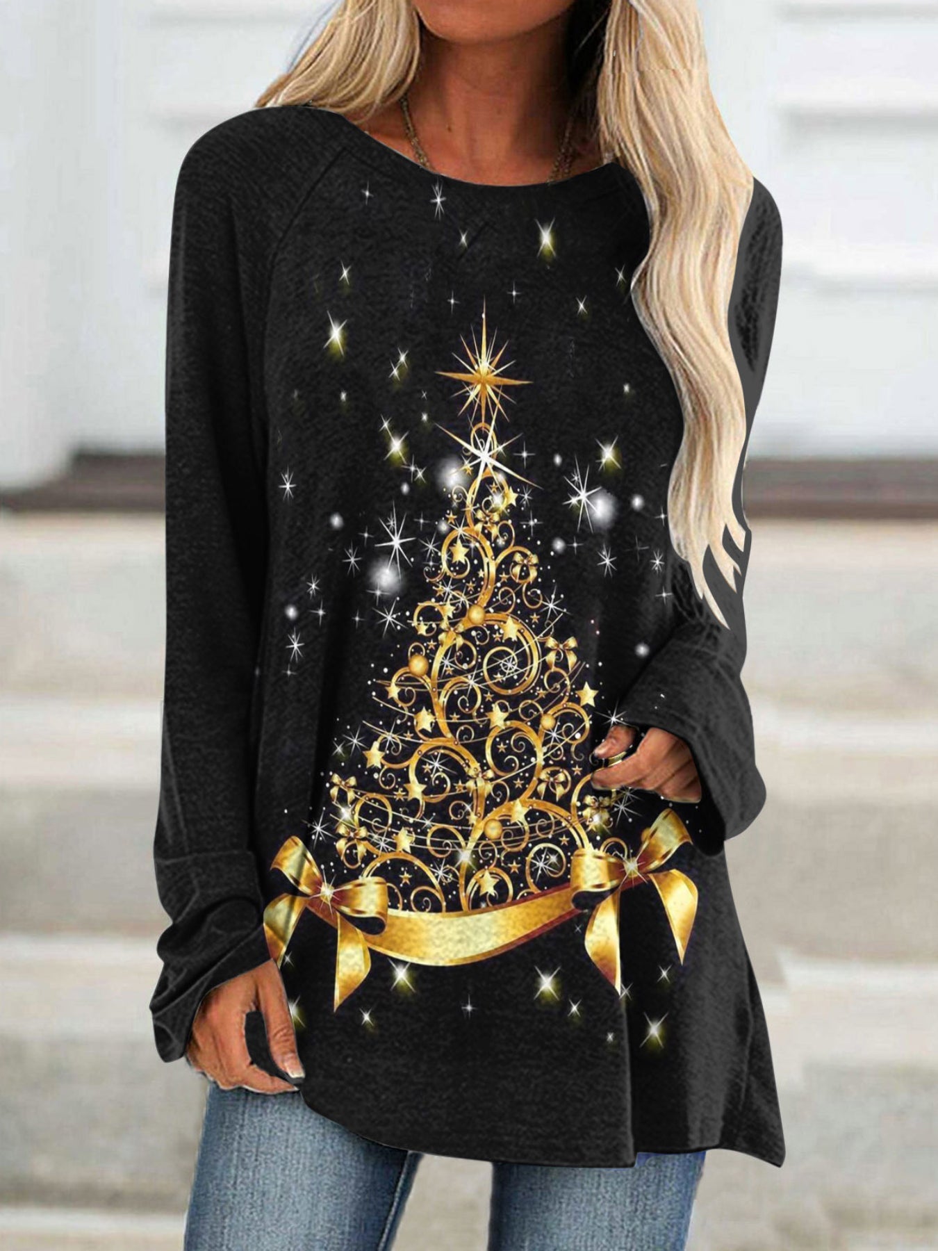 Sale Christmas Casual Top, Women's Tree Print Long Sleeve Round Neck Medium Stretch Tunic Top