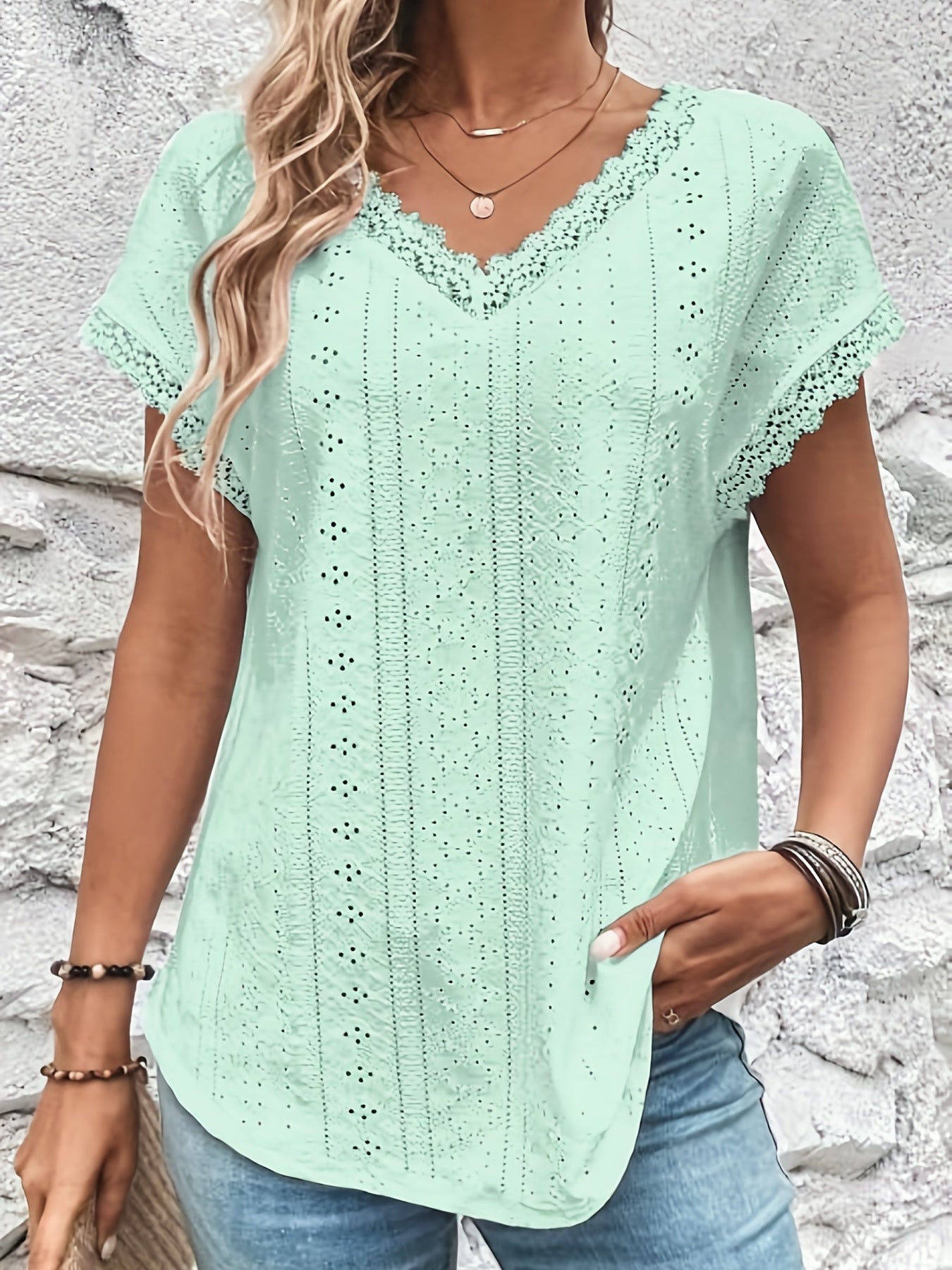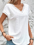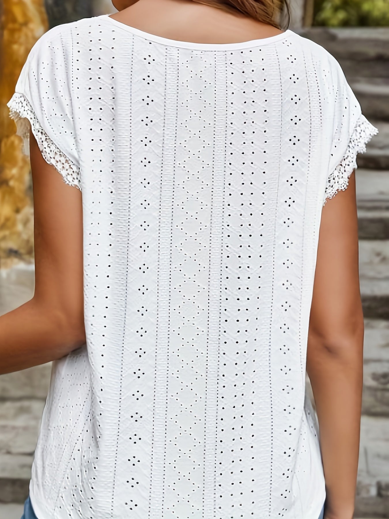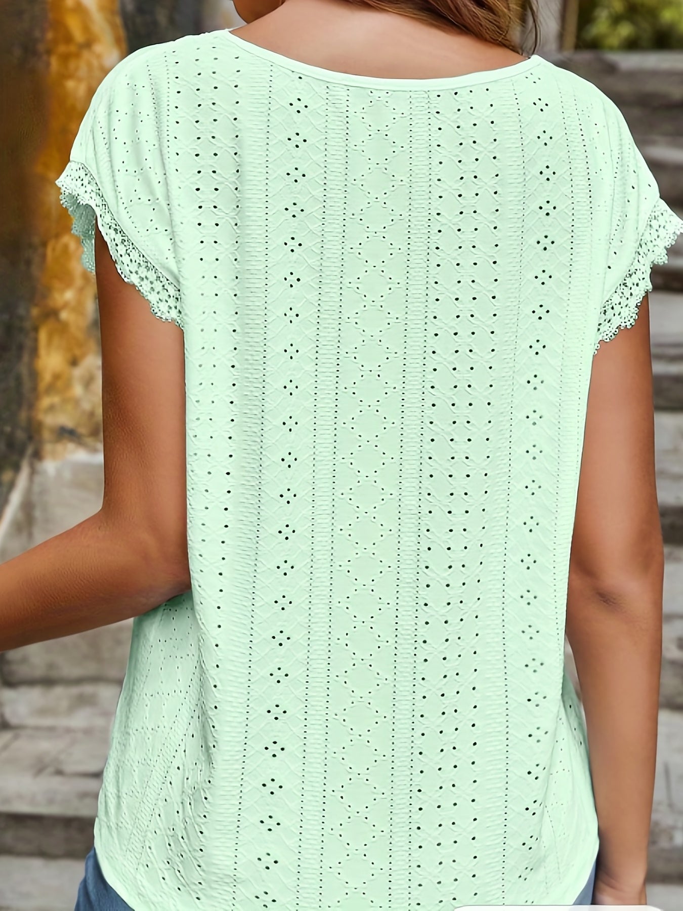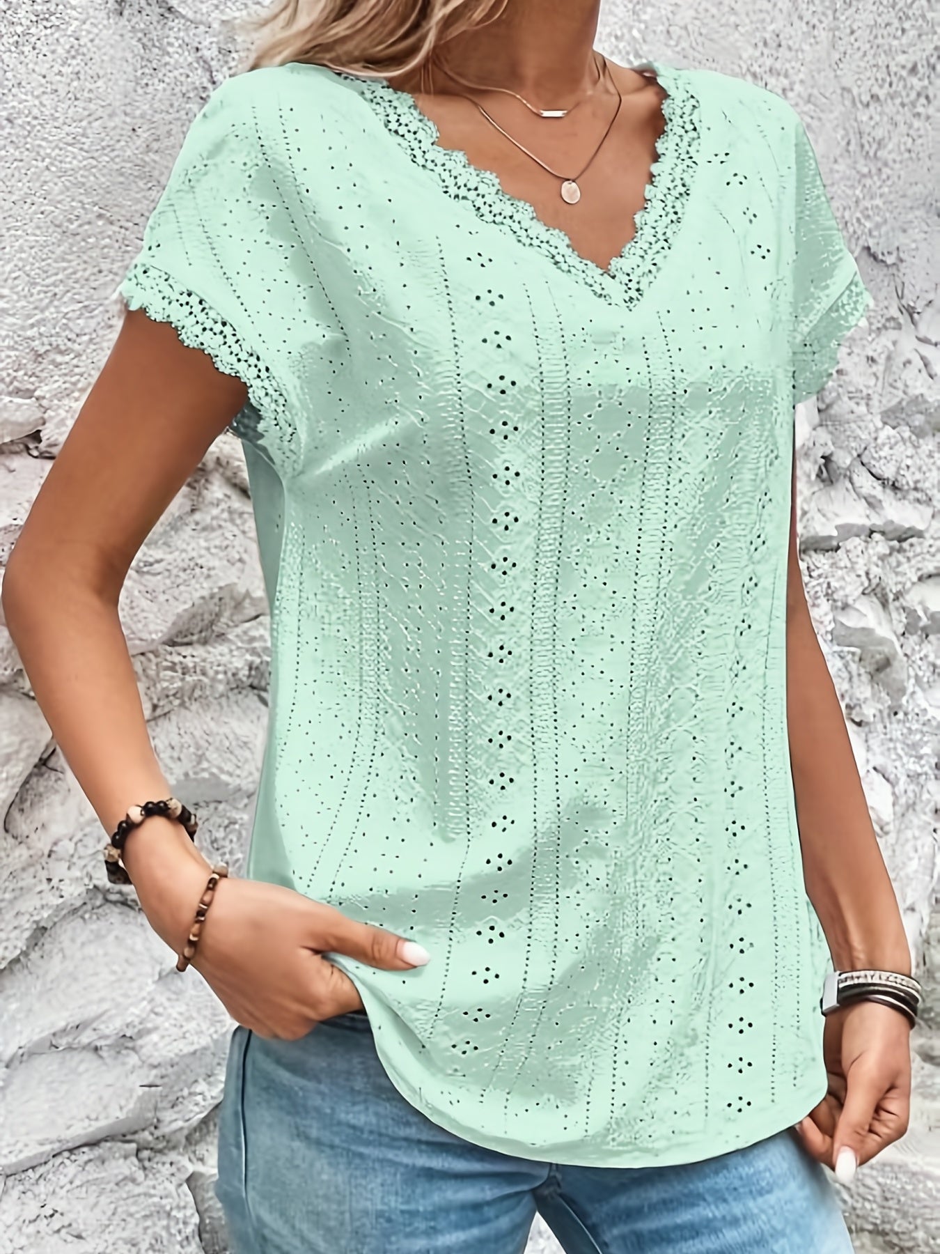 Sale Elegant T-shirt, Women's Eyelet Embroidery Contrast Lace Trim V Neck Short Sleeve Slight Stretch T-shirt