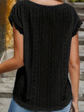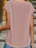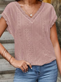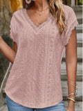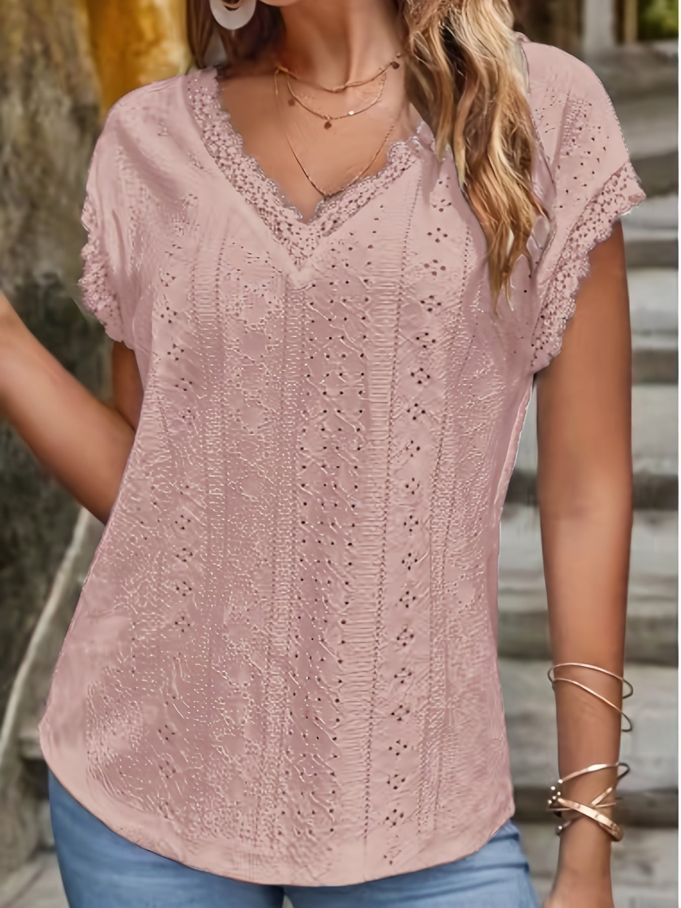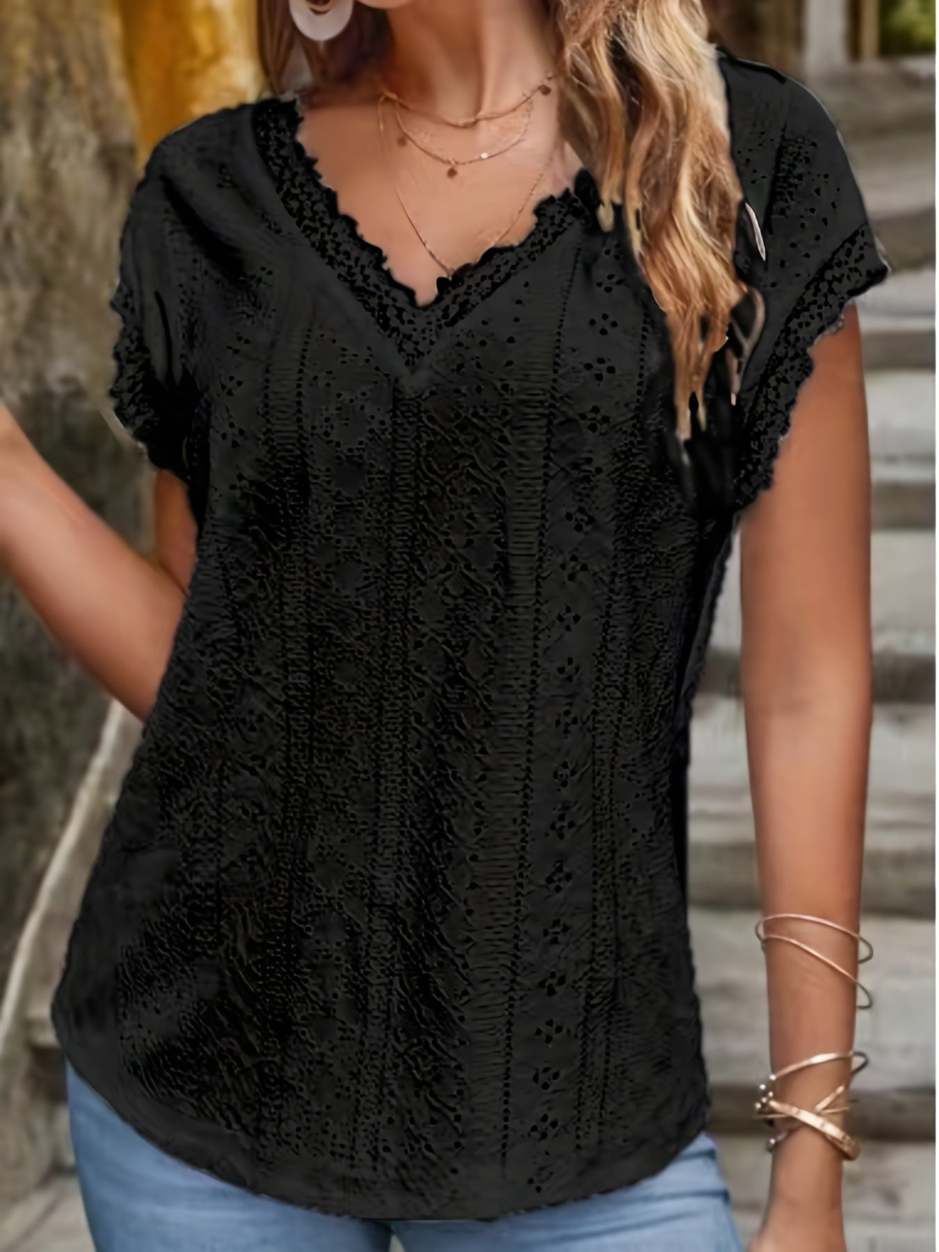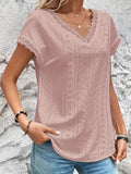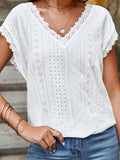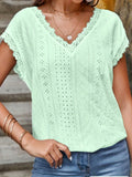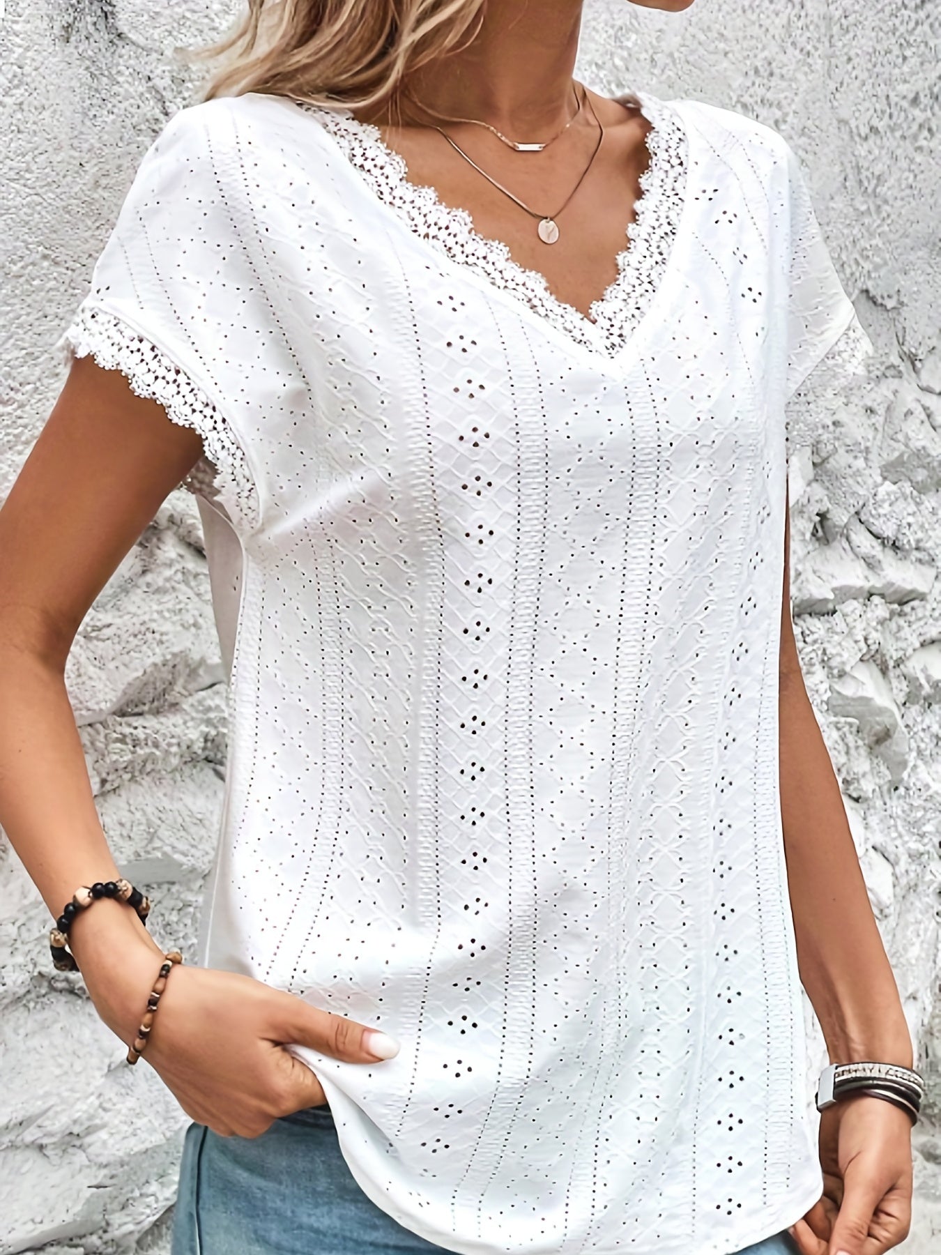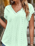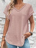 Sale Elegant T-shirt, Women's Eyelet Embroidery Contrast Lace Trim V Neck Short Sleeve Slight Stretch T-shirt