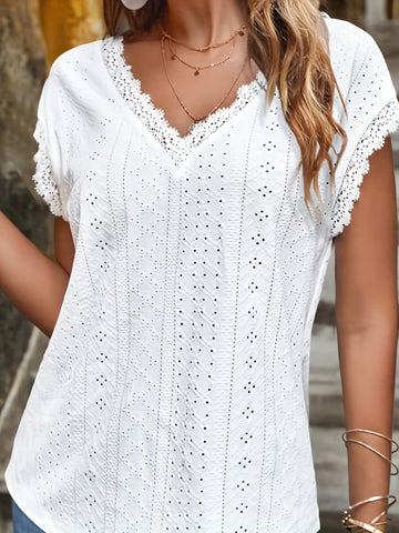 Elegant T-shirt, Women's Eyelet Embroidery Contrast Lace Trim V Neck Short Sleeve Slight Stretch T-shirt