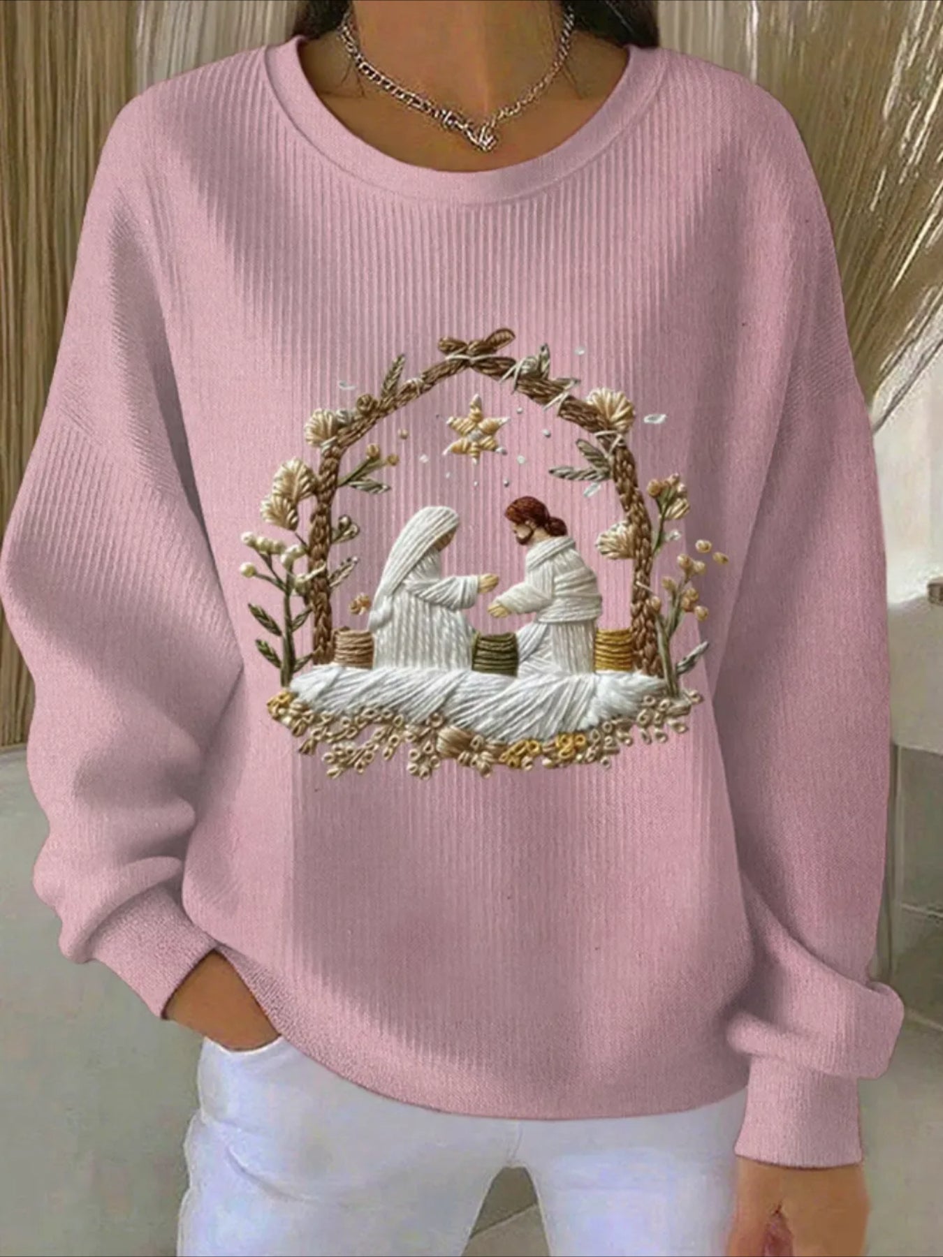 Colorful Ribbed V Neck Braided Print Long Sleeve Regular Sweatshirt