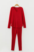 Racing Red Ribbed Notched Neck Knit Long Sleeve Leggings Two Pieces Lounge Set