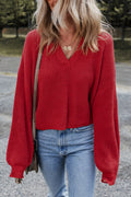 Racing Red Solid Textured Knit V Neck Drop Shoulder Sweater
