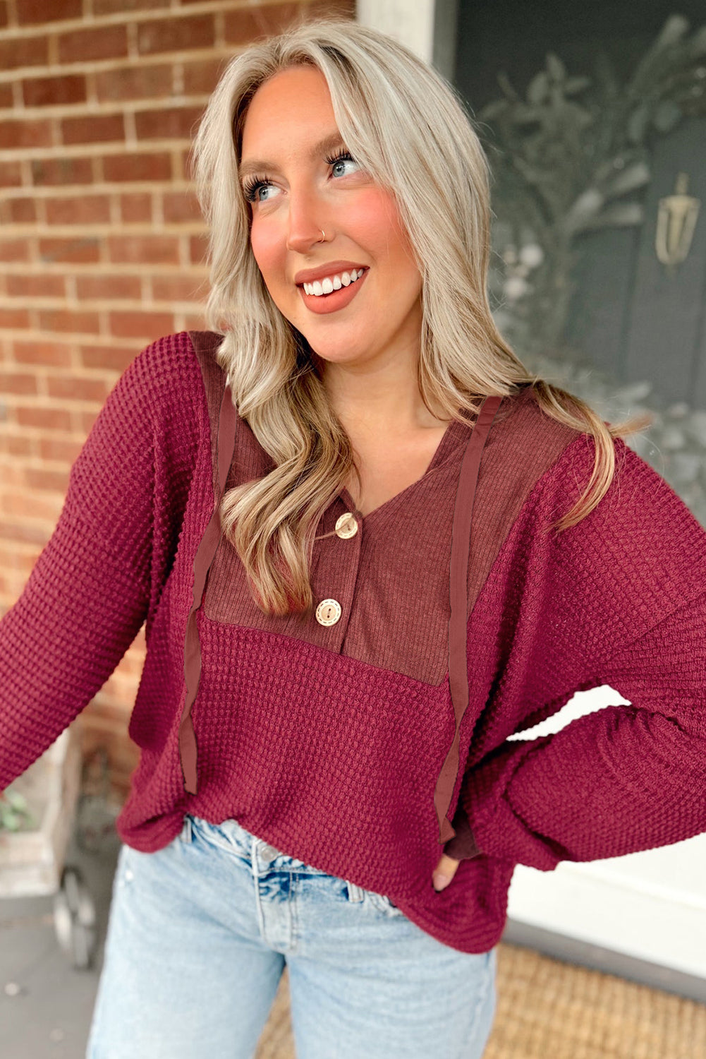 - This waffle top is very stylish ribbed fabric patchwork.The hooded design makes it more casual and fashionable.The buttoned front is chic and easy to wear.Drop shoulder design makes this hooded top more laid-back.