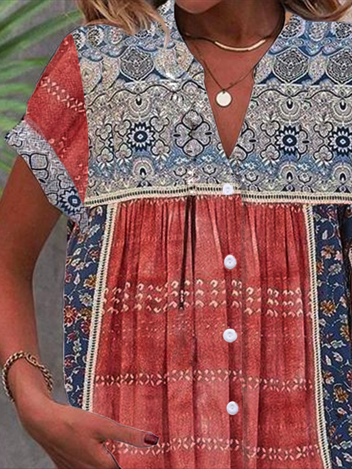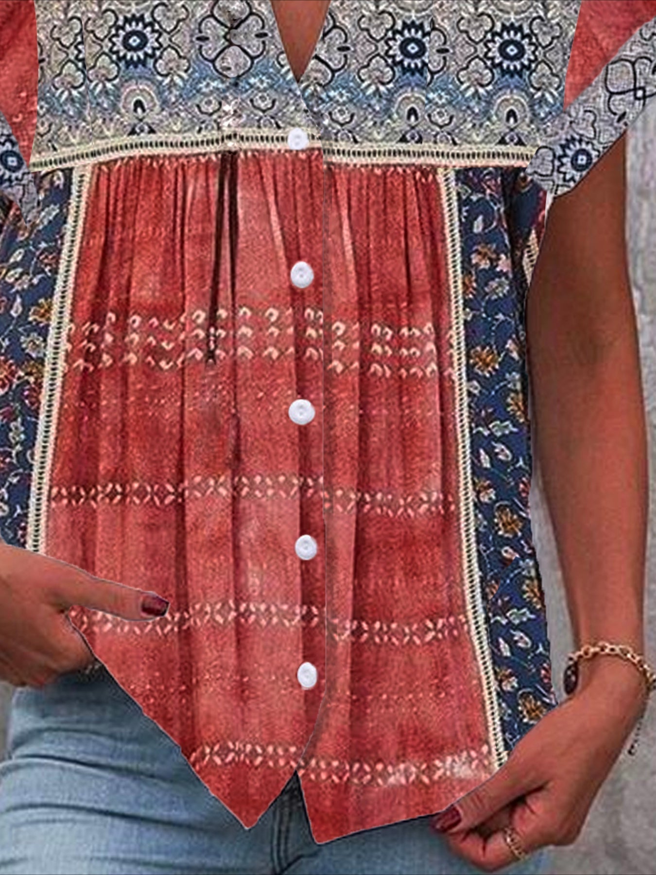 Random Print Short Sleeve Shirt Summer Notched Daily Casual Top