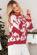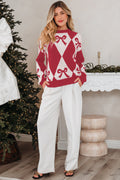 Red Bow Print 2-tone Rhombus Knit Loose Sweater