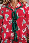 Red Christmas Fashion Print Contrast Ruffle Trim Ribbon Bow Knot 2pcs Pajama Set