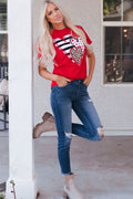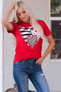 Red Leopard Striped Heart Shaped Print Crew Neck T Shirt