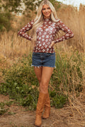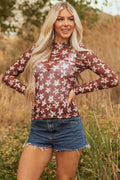 Sale Pink Mesh Floral Print Mock Neck Long Sleeve Slim Top
