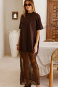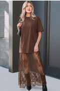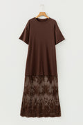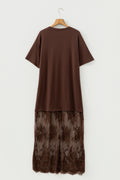 Coffee Short Sleeve Knit Top Patchwork Pleated Long Dress