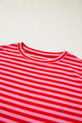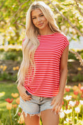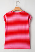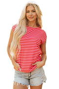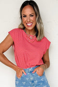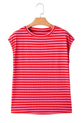 Red Stripe Ribbed Cap Sleeve Round Neck T Shirt