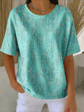 Vintage Cotton-Blend Botanical Pattern V Neck Shirt