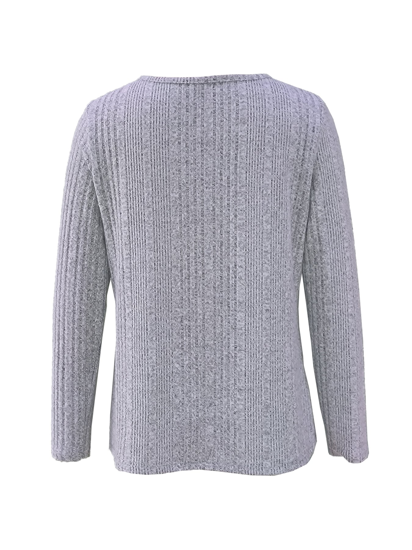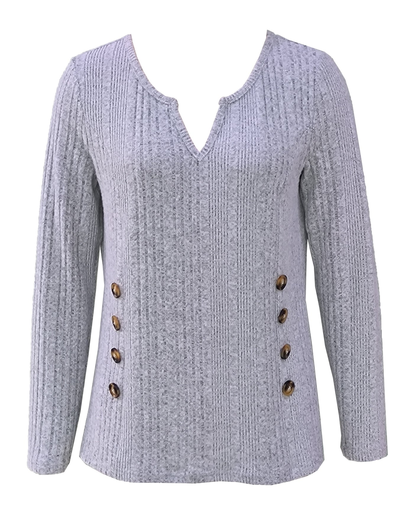 Ribbed Button Decor Notch Neck T-Shirt, Casual Long Sleeve Top