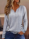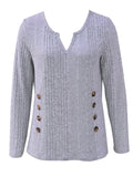 Sale Ribbed Button Decor Notch Neck T-Shirt, Casual Long Sleeve Top