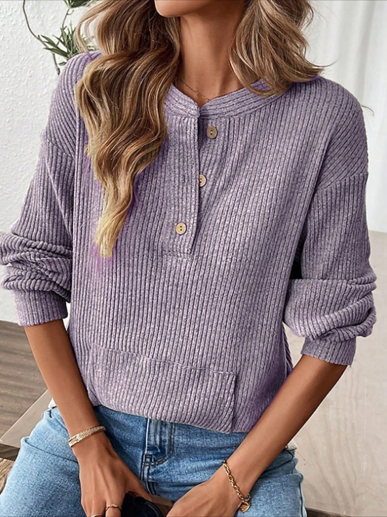 Classic Polo Neck Button-Down Solid Color Sweater Top