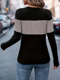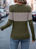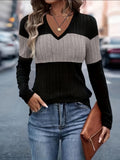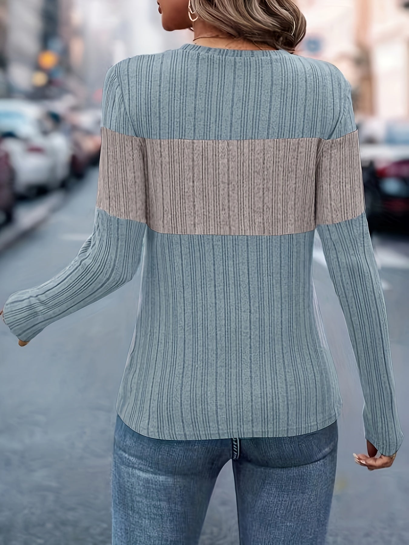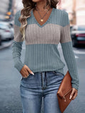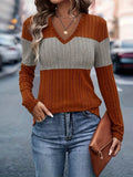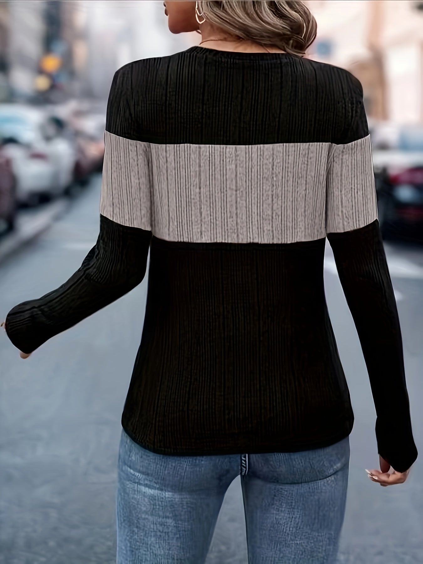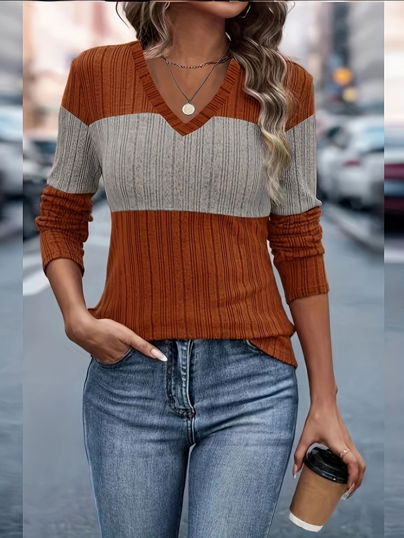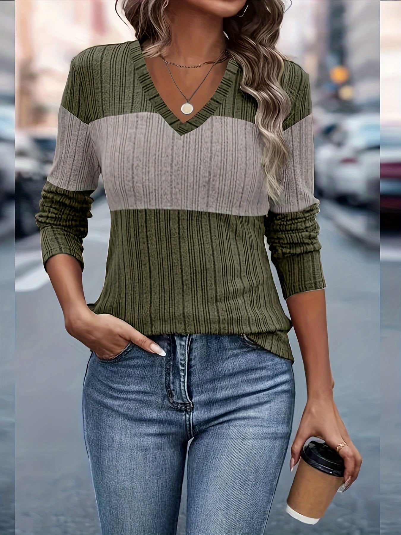 Ribbed Color Block V Neck T-Shirt, Elegant Long Sleeve T-Shirt