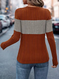 Sale Ribbed Color Block V Neck T-Shirt, Elegant Long Sleeve T-Shirt