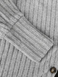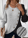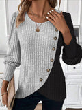Ribbed Crew Neck T-shirt, Elegant Long Sleeve Buton Decor Top