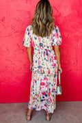 Rose Abstract Print Short Puff Sleeve Tiered Maxi Dress