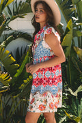 Rose Floral Mixed Pattern Ruffle Flutter Sleeve Buttoned Dress
