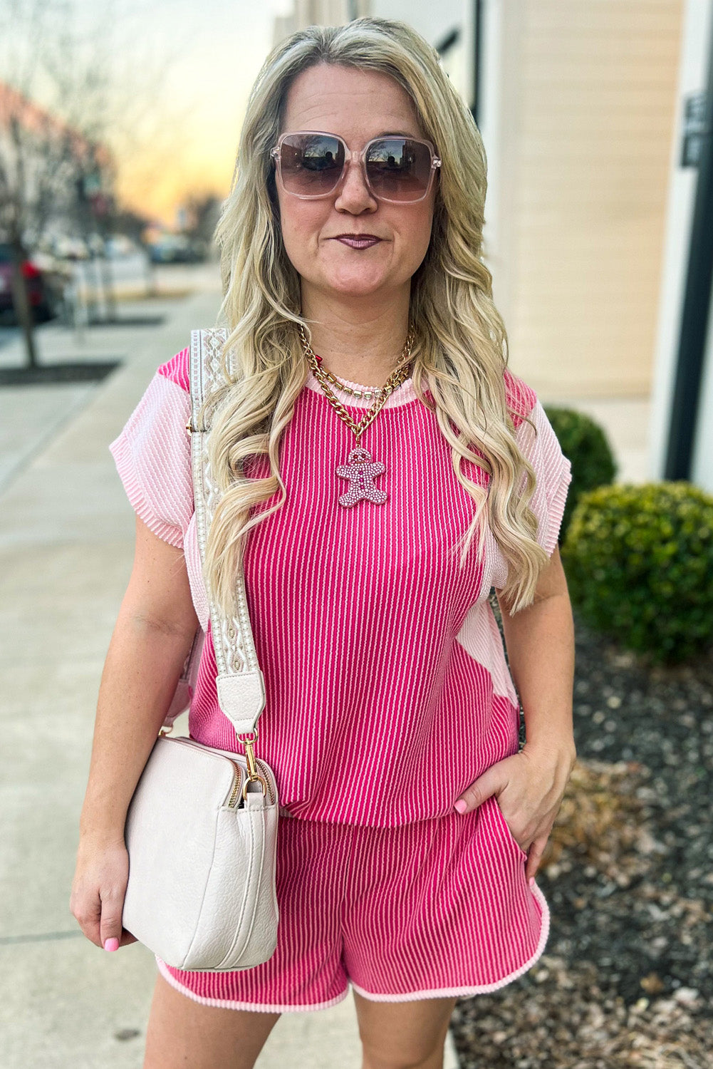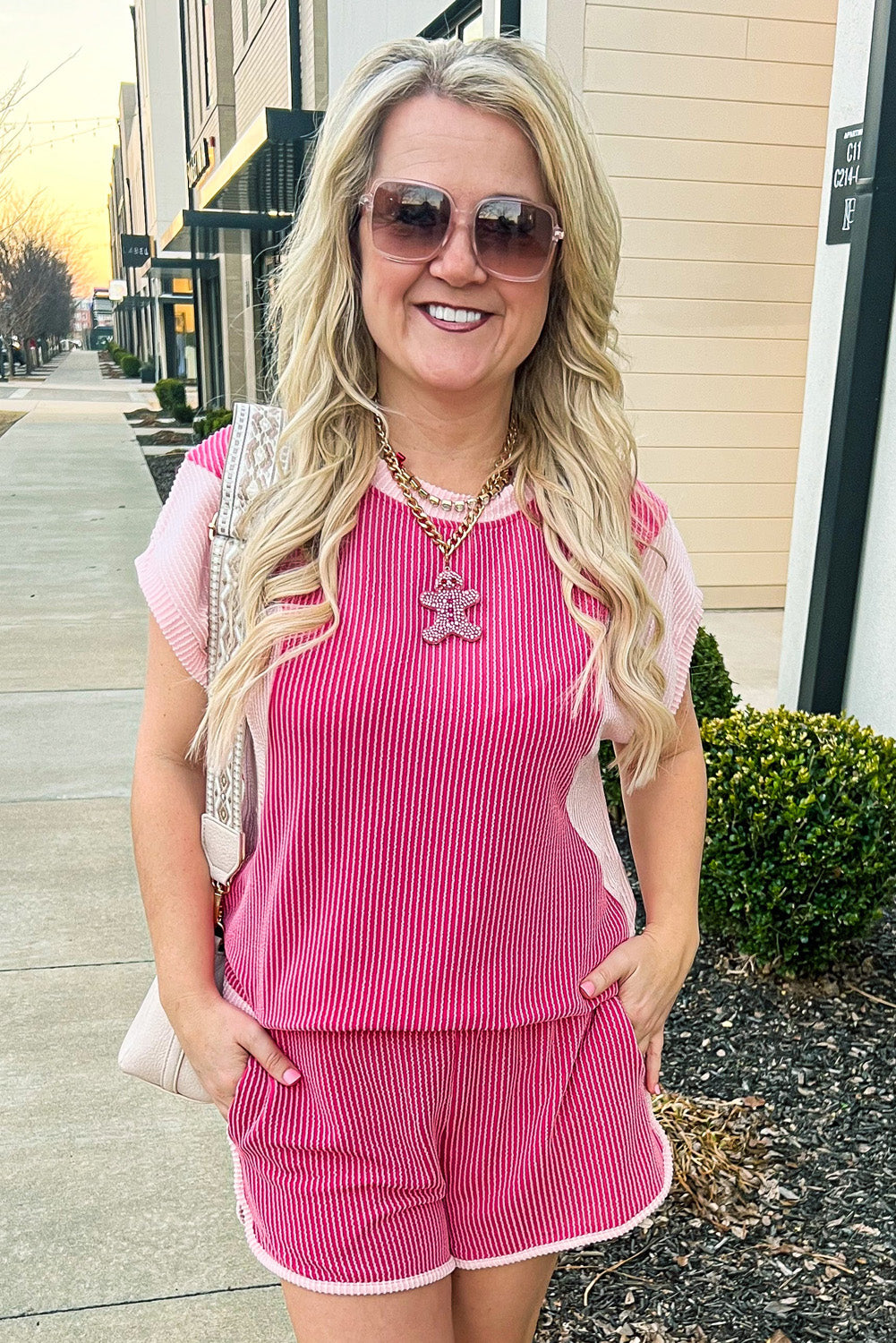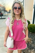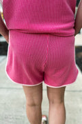 Sale Rose Red 3D Spiral Ribbed Texture 2 Tones Patchwork Short Set