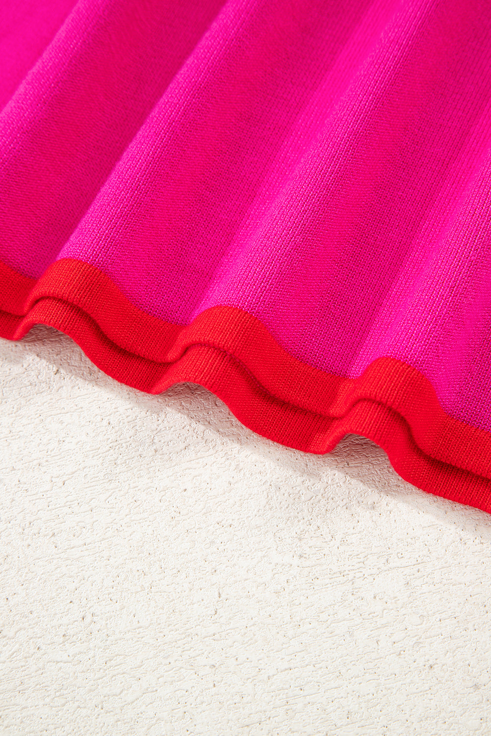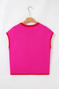 Rose Red Contrast Trim Round Neck Short Sleeve Loose Knit Sweater