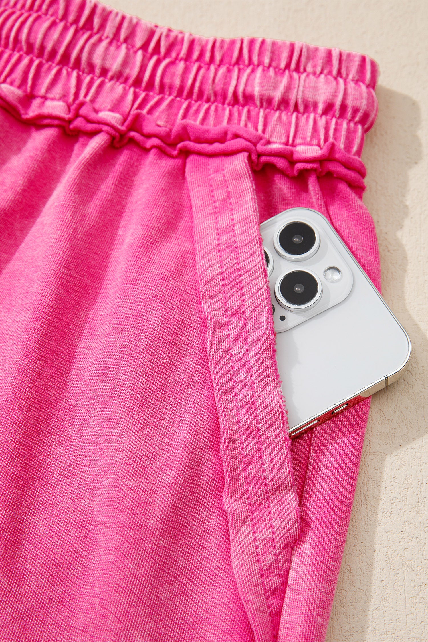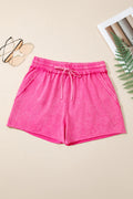 Rose Red Mineral Washed Drawstring Elastic Waist Raw Cut Shorts