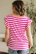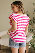 Rose Red Striped Ruffle Sleeve Crew Neck Blouse