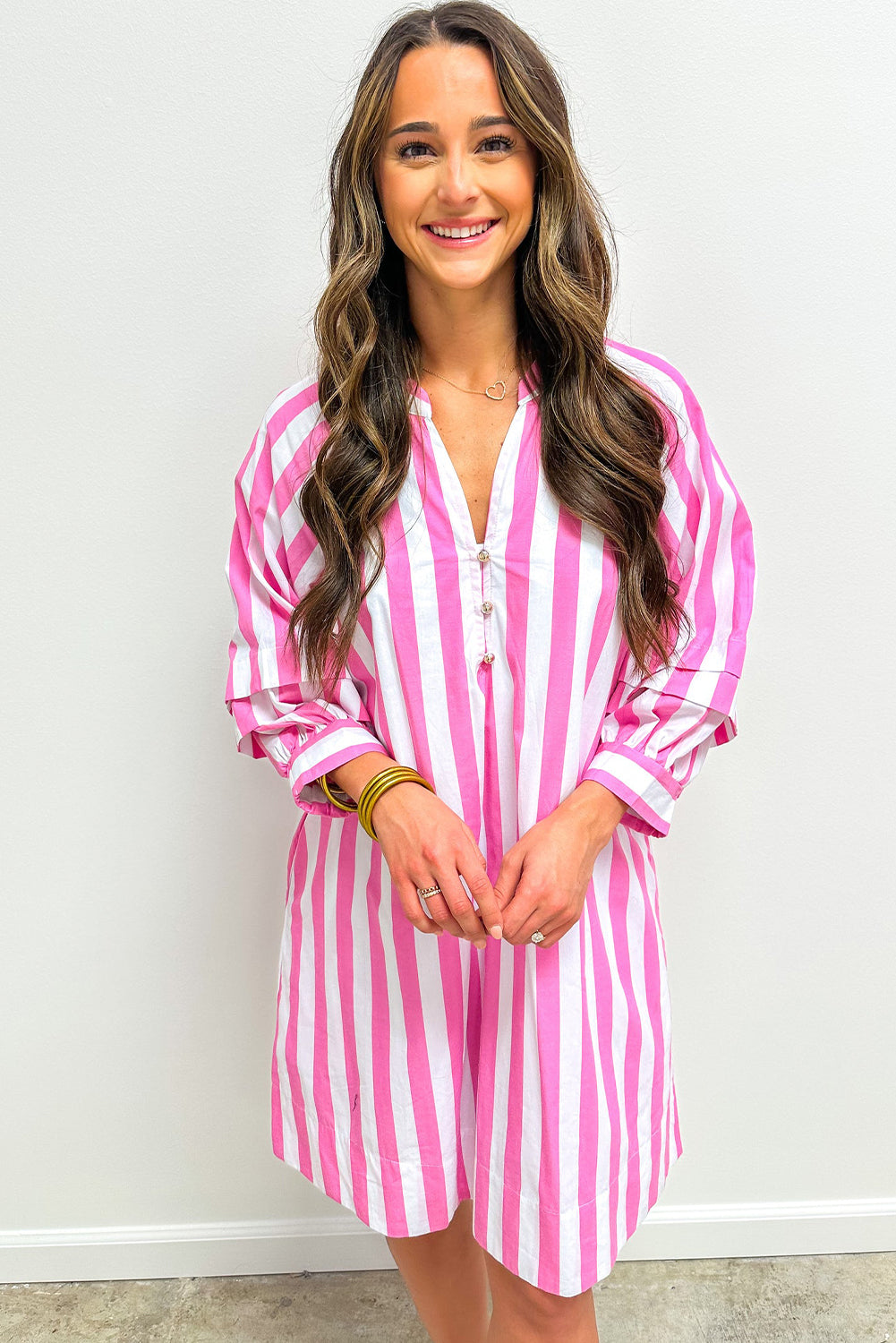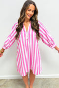 - This pink striped dress is stylish and elegant.Designed with a relaxed fit style which is suitable for most.Button front detail makes it easy to wear and style your way.Bracelet sleeves create an elegant touch and airy comfort.