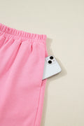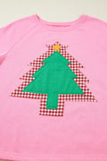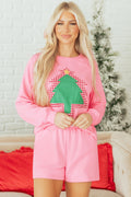 Sachet Pink Plaid Contrasted Double Christmas Tree Patched Raglan Sleeve Pullover 2pcs Short Set