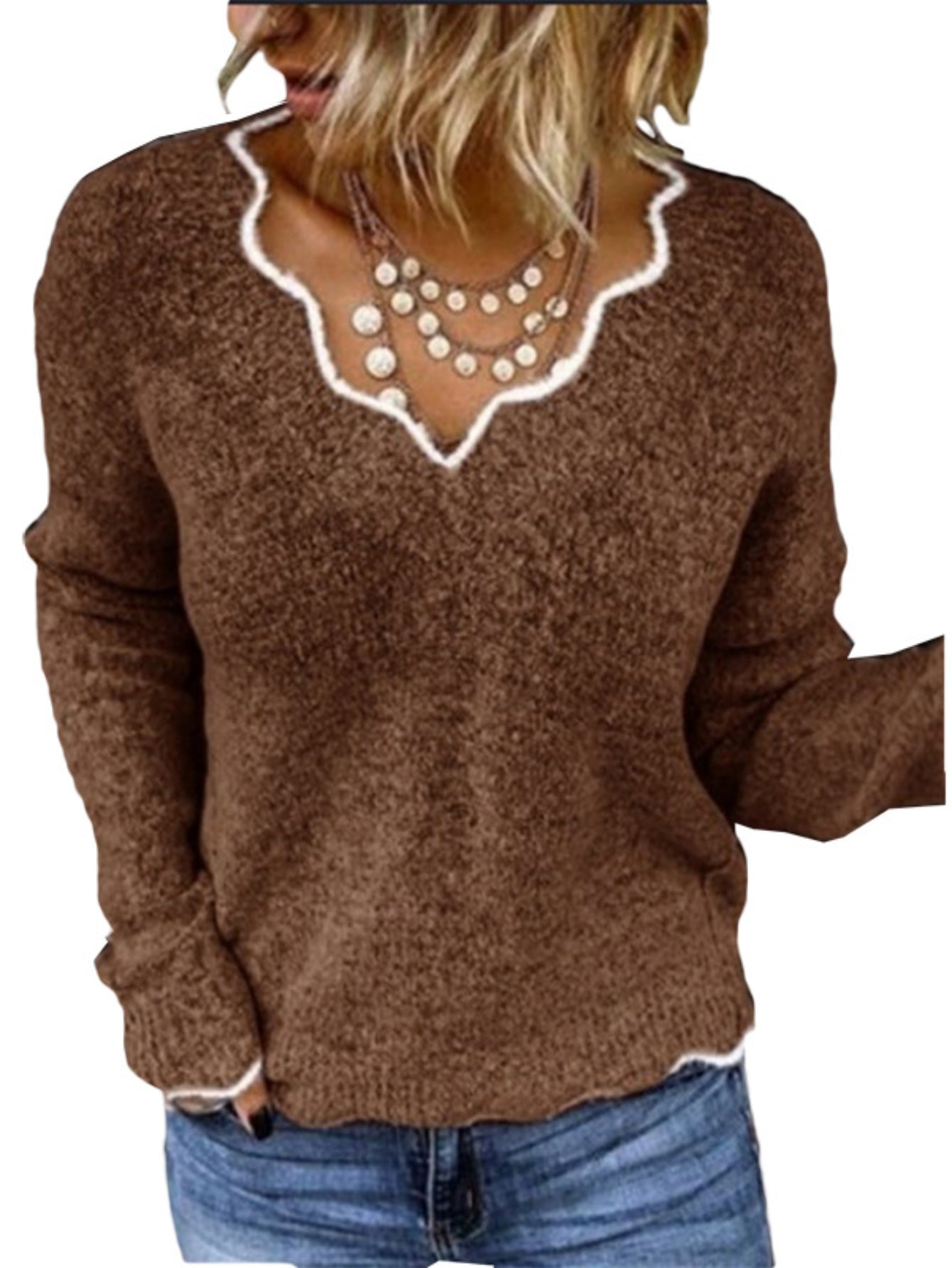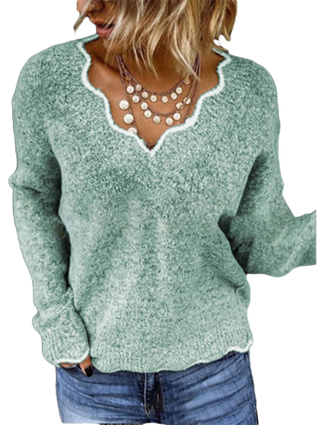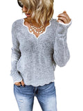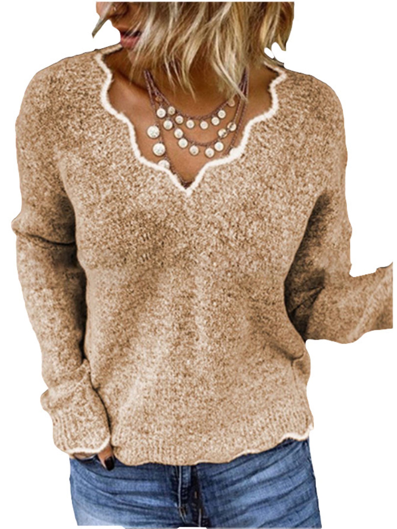Sale Scallop Trim Knit Sweater, Casual V Neck Long Sleeve Sweater