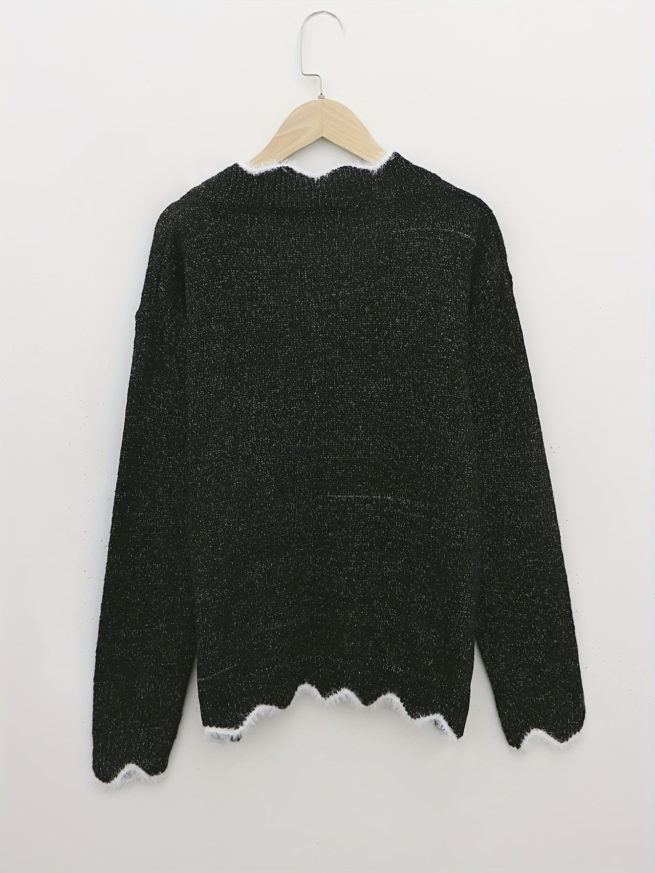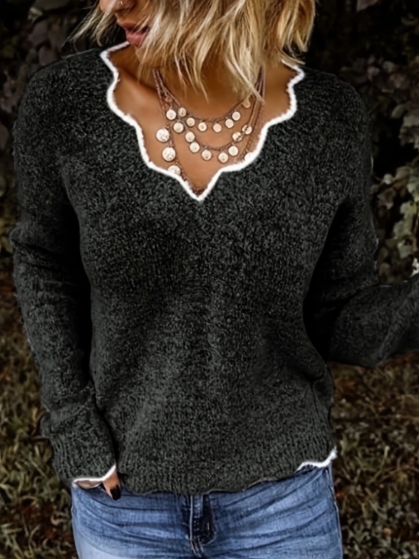 Scallop Trim Knit Sweater, Casual V Neck Long Sleeve Sweater