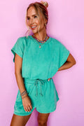 Sale Sea Green Mineral Wash Drawstring Waist Hollow Out Back Short Sleeve Romper