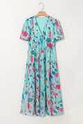 Sky Blue Abstract Print Short Puff Sleeve Tiered Maxi Dress