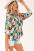 Sky Blue Floral Collared V Neck Roll up Sleeve Shift Blouse