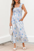 Sky Blue Floral Smocked High Waist Double Ruffle Sleeveless Long Dress