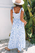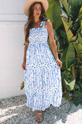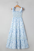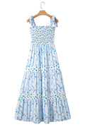 Sky Blue Floral Smocked Tied Straps A-Lined Tiered Maxi Dress