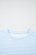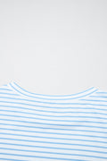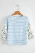 Sky Blue Stripe Floral Three Quarter Sleeves Patchwork Drop Shoulder Top