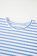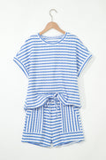 Sale Sky Blue Stripe Knitted Short Sleeve Top and Drawstring Shorts Set
