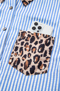 Sky Blue Striped Leopard Print Patchwork Button Up Womens Shirt