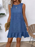 Solid Blue Round Neck Lightweight Sleeveless A-Line Dress with Back Bow Tie Detail