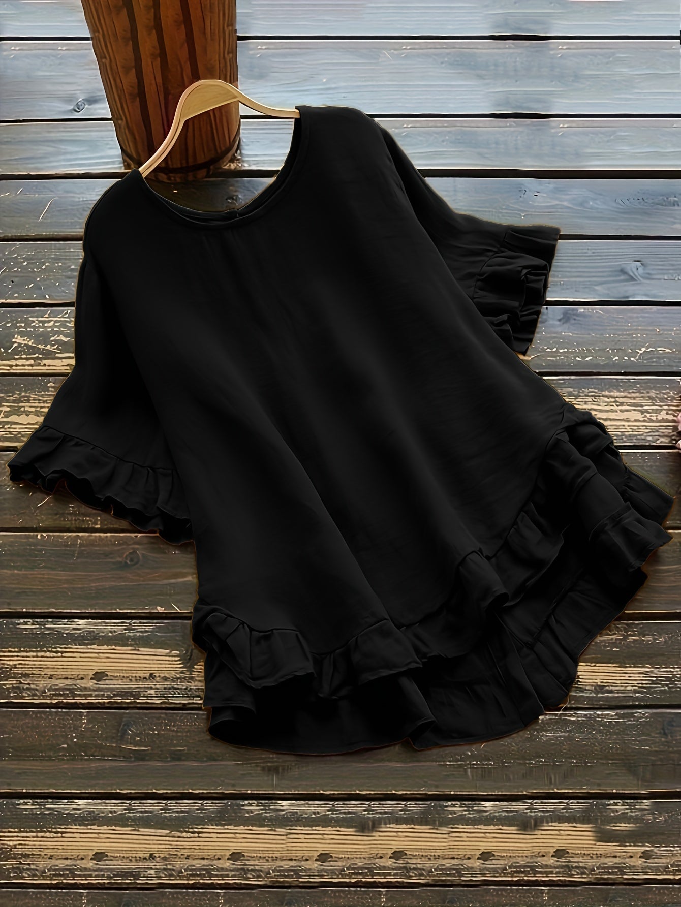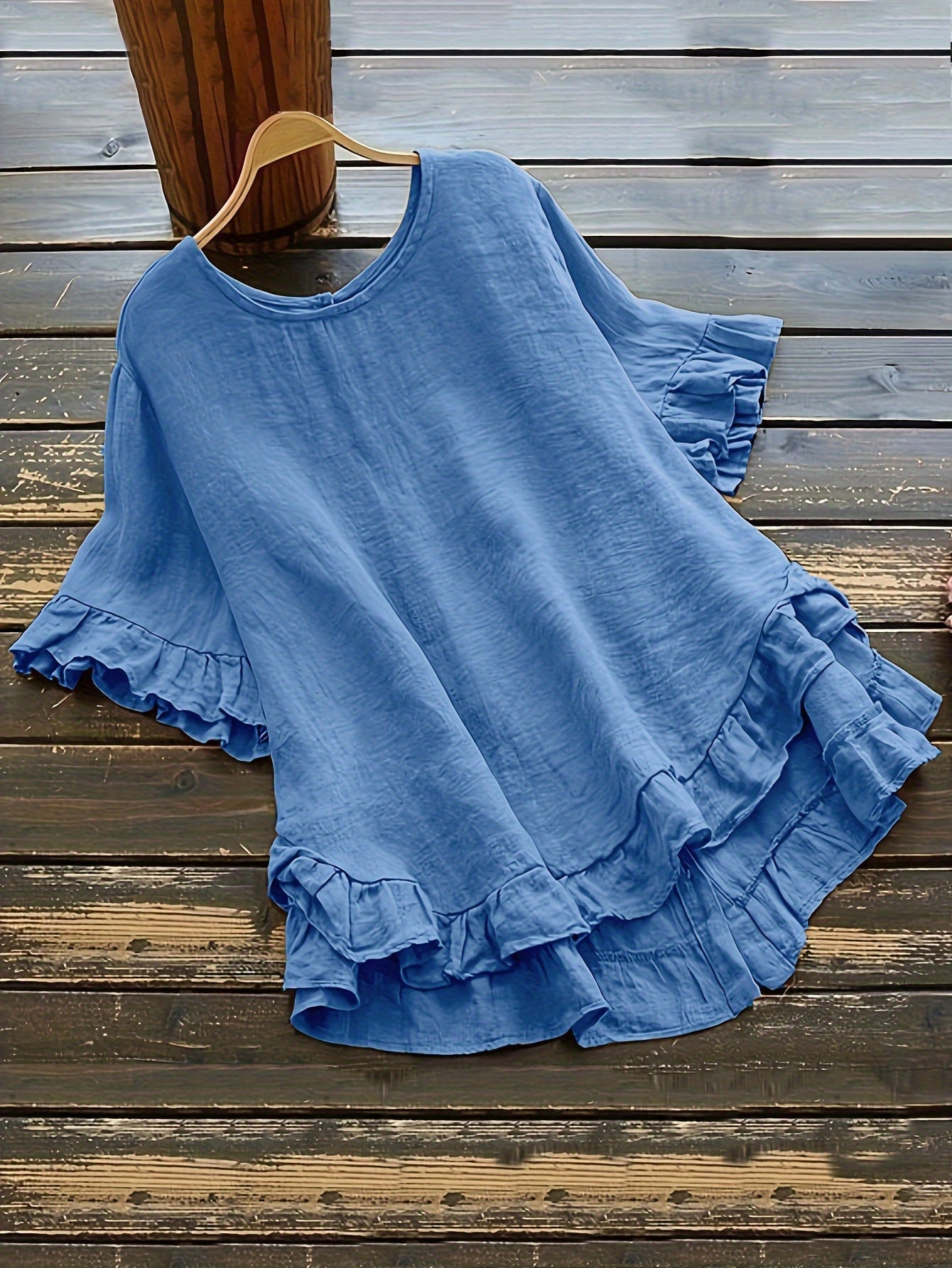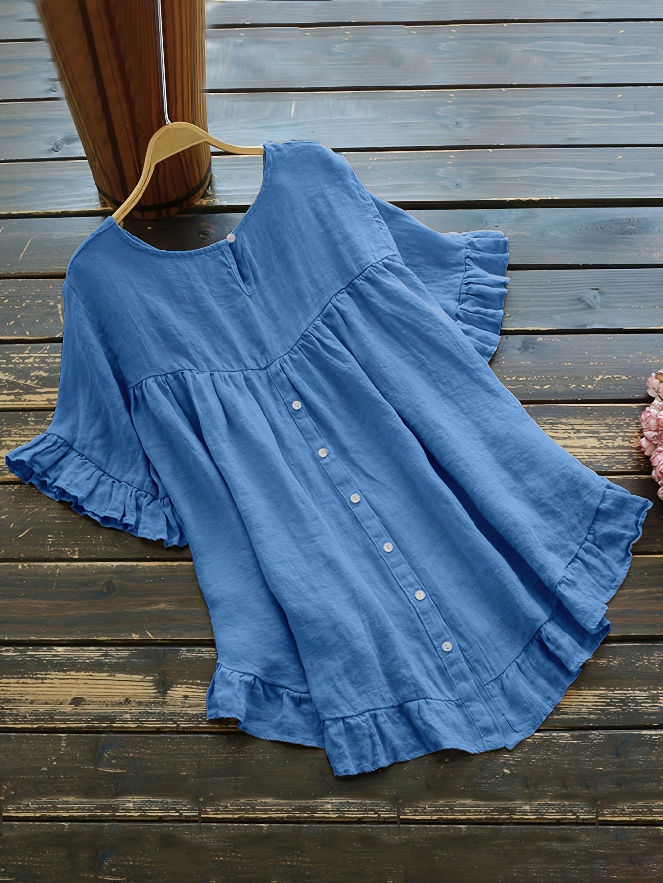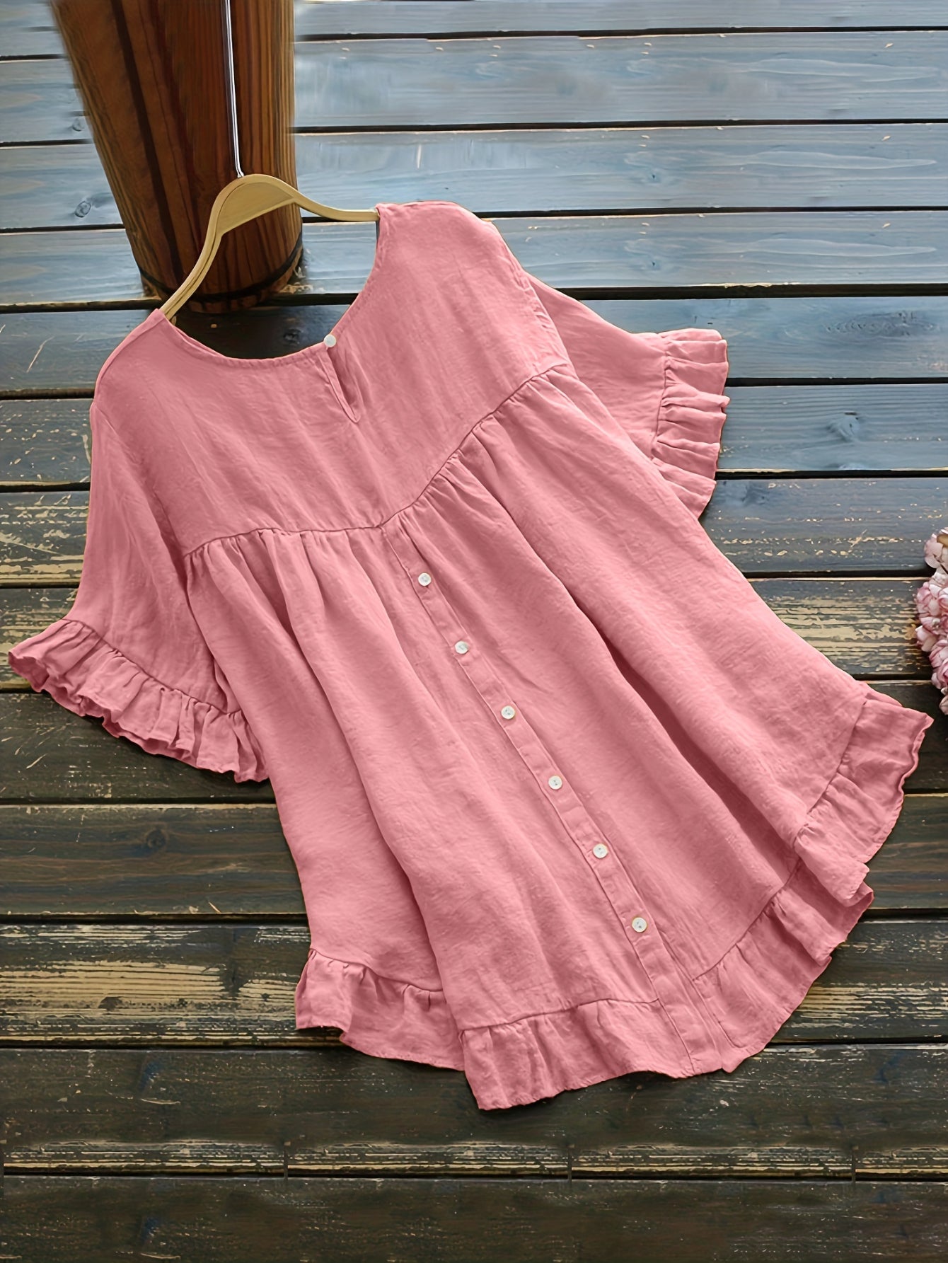 Solid Button Back Ruffled Trim Blouse, Casual Short Sleeve Blouse